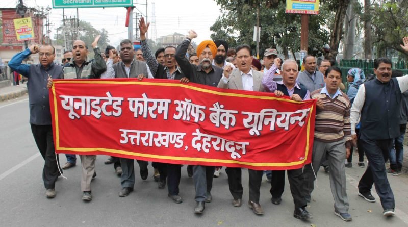 دہرادون. طویل تحریک کے بعد بھی مطالبہ پورا نہ ہونے پر بینک کے عملے کا غصہ بڑھ گیا اور مانگو کو لے کر آج متحد فورم آف بینک یونین کے بینر تلے بینک ملازمین نے کام بائیکاٹ کر اپنا غصہ کیا. پہلے سے مقرر پروگرام کے مطابق منگل کو بینک ملازم ہڑتال پر رہے اور اپنے مطالبات کو لے کر متحد فورم اپھ بینک يونيس سے منسلک نے دارالحکومت دہرادون سمیت دیگر اضلاع میں ملازمین نے مظاہرہ کیا. بینک ملازمین نے پریڈ میدان سے ریلی بھی نکالی. حکومت کی عوام مخالف پالیسیوں، ٹریڈ یونینوں کے افسر ختم کرنے نوٹبدي کے دوران بینک کے اہلکاروں کو مناسب معاوضہ نہ دیئے جانے وغیرہ کے خلاف بینک ملازمین مخر ہیں. مختلف مطالبات اور مسائل کو لے کر ہڑتال کی جا رہی ہے. ایسوسی ایشن کے اپمهاسچو ہری اوم رےكھي اور يونيس کے کنوینر جگموہن مےهديرتتا نے کہا کہ مرکزی حکومت ٹریڈ یونین کے حقوق کرنے اور بینکوں کی نجکاری پر تلی ہوئی ہے. قرض وصولی کے لئے مؤثر اقدامات نہیں اٹھائے جا رہے ہیں. بینک ملازمین نے بڑھتے ہوئے این پی اے سے نمٹنے کے لئے ریکوری عمل کو تیز رفتار میں اپنانے کی کوشش کی ہے. غصہ کا اظہار کرتے ہوئے کہا کہ بینک کے اہلکاروں کے مطالبات کو فی حسی پیروی ہوئی ہے. اس کی وجہ سے ہی ملک بھر کے 10 لاکھ سے زائد ملازمین ایک روزہ ہڑتال پر گئے. ہڑتال میں بینکنگ سے منسلک سات اہم یونین شامل ہیں. ہڑتال کی وجہ سے بی آئی سمیت دیگر سرکاری و نجی بینکوں کی تمام شاخوں میں کام کاج ٹھپ ہے. یہ بات بتایا جا گیا کہ بینکوں کے اے ٹی ایم میں بالوں نہیں ہیں. کام بائیکاٹ کرتے ہوئے اسٹیٹ بینک اہم شاخ میں بینک اہلکاروں نے مظاہرہ کیا. ساتھ ہی مرکزی حکومت کے خلاف نعرے بازی کی. اس موقع پر بینکوں میں آؤٹ سورسنگ بند کرنے، نوٹبدي کے دوران بینک کے اہلکاروں کی طرف سے کئے گئے کام کا الگ سے فائدہ دینے سمیت دیگر مطالبات شامل ہیں.