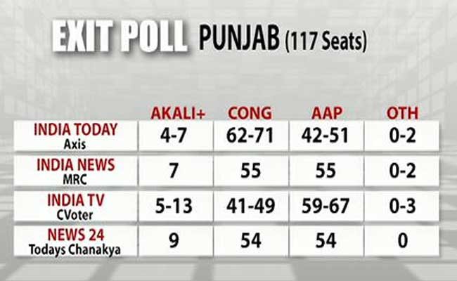 انڈیا ٹی وی- سی ووٹر کے ایگزٹ پول کے مطابق ایگزٹ پول کے مطابق 117 سیٹ والی پنجاب اسمبلی میں آپ کو 59-67 نشستوں کے ساتھ اکثریت ملنے کی بات کہی گئی ہے اور کانگریس کو 41-49 نشستوں کے ساتھ دوسرے نمبر کی پارٹی بتایا گیا ہے. سی ووٹر نے بھی شرومنی اکالی دل اور بی جے پی اتحاد کا سوپڑا صاف ہوتا دکھایا ہے. سی ووٹر کے مطابق اکالی-بی جے پی گٹھبدھن5-139 سیٹوں تک محدود رہ سکتی ہیں. دیگر تین سیٹیں مل سکتی ہیں.