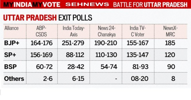 اے بی پی نيوج- ایس پی کانگریس (156-169) بی جے پی (164-176) بی ایس پی (60-72) دیگر (2-6)