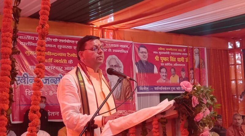 چیف منسٹر جناب پشکر سنگھ دھامی نے نینی تال ضلع کے رام گڑھ میں شانتی نکیتن ٹرسٹ فار ہمالیہ کے زیراہتمام گرودیو رابندر ناتھ ٹیگور کے 161 ویں یوم پیدائش کے مبارک موقع پر منعقدہ رویندر جنم سوت 2022 پروگرام کا چراغ جلا کر افتتاح کیا۔ پروگرام کے دوران کنوینر پروفیسر اتل جوشی، علاقائی ایم ایل اے شری رام سنگھ کیڈا، سابق خارجہ سکریٹری ششانک، دیویندر ڈھیلا دیویندر بشٹ، بی جے پی منڈل کے صدر کندن چلوال وغیرہ نے میمنٹو، جسمانی لباس اور دیگر عوامی نمائندوں کو وزیر اعلیٰ کا اعزاز دیا۔ چیف منسٹر شری دھامی نے گرودیو رابندر ناتھ ٹیگور کو ان کے 161 ویں یوم پیدائش پر مبارکباد دی اور رام گڑھ وشو بھارتی سنٹرل یونیورسٹی کے پہلے کیمپس کا بھومی پوجن بھی کیا۔ انہوں نے کہا کہ ریاستی حکومت بغیر کسی انتخاب کے قرارداد کے منتر پر چل رہی ہے اور عوام کی فلاح و بہبود کے لئے وقف ہے۔ وزیر اعظم کی قیادت میں حکومت عوامی فلاح و بہبود کے جذبے کے مطابق ریاست کی ہمہ جہت ترقی کر رہی ہے۔ وزیر اعظم کو ریاست سے گہرا لگاؤ ہے۔ وزیر اعلیٰ نے کہا کہ ان کی حکومت سب کا ساتھ اور سب کا وکاس کے تحت کام کرنے کے لیے پرعزم ہے۔ گرودیو رابندر ناتھ ٹیگور کا کرما اسٹال رام گڑھ خطے کے ٹیگور ٹاپ پر واقع ہے جہاں وہ 19ویں صدی میں 5 بار یہاں آئے اور اپنی شاعری کی۔ انہیں ادب کا نوبل انعام ملا، جو کسی ایشیائی کو دیا جانے والا پہلا نوبل انعام تھا۔ وزیر اعلیٰ نے کہا کہ وزیر اعظم جناب نریندر مودی نے رام گڑھ میں رابندر ناتھ ٹیگور یونیورسٹی کا کیمپس قائم کرنے میں اپنی دلچسپی ظاہر کی ہے جو کہ اتراکھنڈ کے لیے فخر کی بات ہے۔ وزیر اعلیٰ شری دھامی نے کہا کہ اس تحفے سے جہاں وشو بھارتی سنٹرل یونیورسٹی، اتراکھنڈ کو ہندوستان کے ایک بڑے تعلیمی مرکز کے طور پر قائم ہونے کا موقع ملے گا۔ اس کے ساتھ ساتھ مقامی نوجوانوں کے لیے خود روزگار کے نئے مواقع میسر ہوں گے اور یہ قومی اور بین الاقوامی محققین کے لیے بھی ایک نئی منزل بن جائے گا۔ انہوں نے کہا کہ اس کے لیے مرکزی ریاست میں سیاحت کے مرکزی وزیر اور رکن پارلیمنٹ شری اجے بھٹ، سابق مرکزی وزیر تعلیم ڈاکٹر رمیش پوکھریال نشنک کی طرف سے خصوصی کوششیں کی گئیں۔ انہوں نے کہا کہ وشو بھارتی کے قیام کے لیے پہلے مرحلے میں 150 کروڑ روپے کا ڈی پی آر مرکزی حکومت میں منظوری کے مراحل میں ہے، 45 ایکڑ اراضی میں وشو بھارتی سنٹرل یونیورسٹی کے کیمپس کے قیام کی رسمی کارروائی اتراکھنڈ حکومت مکمل ہو چکی ہے۔ انہوں نے پروفیسر ودیوت چکرورتی، وائس چانسلر وشوابھارتی مغربی بنگال اور ہمالیہ کے لیے شانتی نکیتن ٹرسٹ کے مہاجرین کا بھی شکریہ ادا کیا۔ , انہوں نے کہا کہ یہ دہائی اتراکھنڈ کی ہوگی۔ اس پروگرام میں جو ملک کی بہترین ریاست ہو گی، گورنمنٹ ہائر سیکنڈری اسکول رام گڑھ کی ثقافتی اور دیو بھومی ثقافتی ٹیم کی طرف سے چولیا رقص پیش کیا گیا۔ اس موقع پر رویند سریجانیکا کے عنوان سے ایک کتابچہ بھی جاری کیا گیا۔ اس موقع پر ایم ایل اے بھیمتل رام سنگھ کیڈا، کماؤن یونیورسٹی کے وائس چانسلر این کے جوشی، ضلع مجسٹریٹ دھیرج سنگھگربیال، سینئر سپرنٹنڈنٹ آف پولس پنکج بھٹ، ایڈیشنل ڈسٹرکٹ مجسٹریٹ اشوک جوشی، پروجیکٹ انسٹرکشن اجے سنگھ، ابے پرساد باجپائی، جنرل منیجر کے ایم وی این، ایس ڈی ایم دھاری یوگ، دیگر موجود تھے۔ مہرا، بلاک ہیڈ دھاری آشا رانی، کنور سنگھ نیگی، ڈاکٹر انیل کپور ڈبو، ڈاکٹر درگیش پنت، دیا پوکھریا، رویندرا، پرنسپل ریکھا جوشی سمیت مختلف محکموں کے افسران، بڑی بھیڑ موجود تھی۔